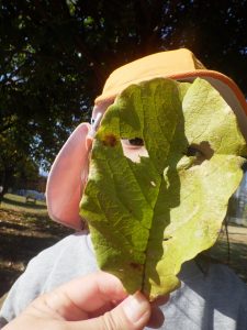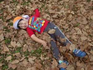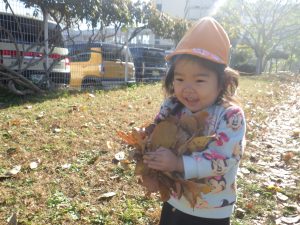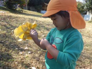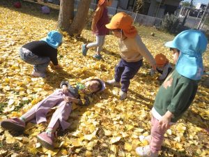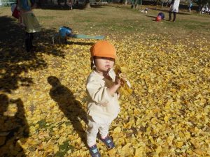 葉っぱが茶色くなってくると、カサカサ、パリパリという音が聞こえてきて、ジャンプしたり寝転がってみたり、全身で楽しんでいました!