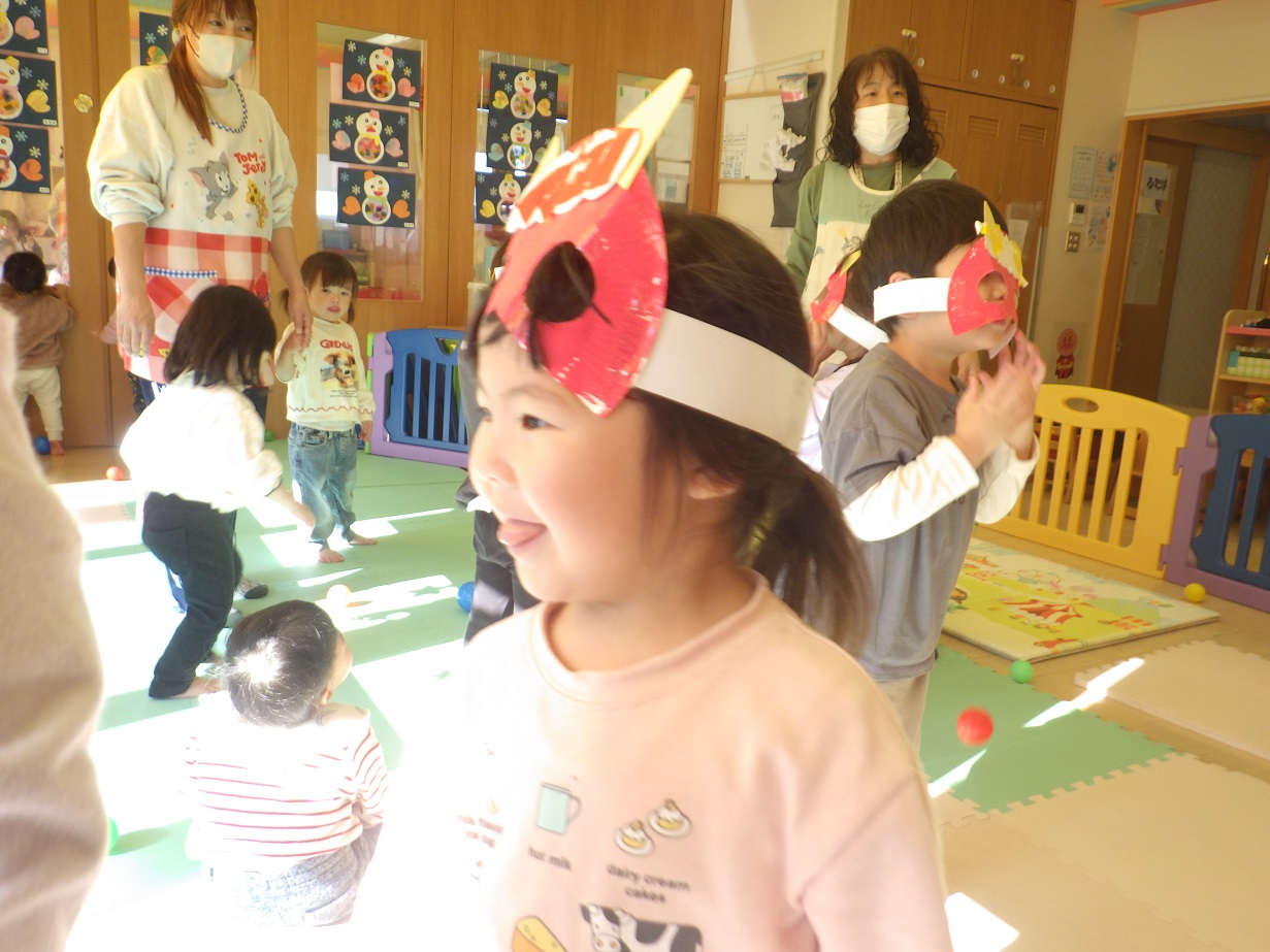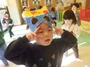 節分当日、可愛い小鬼になって、つぼみ組さんと一緒に豆まきごっこをしました✨